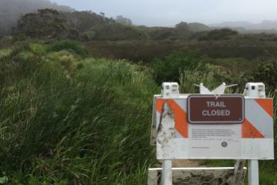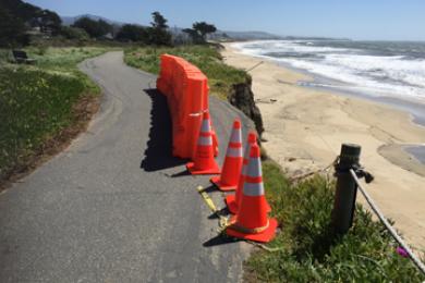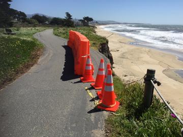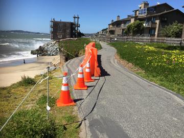 The coastal trail, from Half Moon Bay harbor south to the Ritz Carlton, runs through some State Park properties. At one location, in Miramar, the trail is now perilously close to the edge of the cliff due to coastal bluff erosion.