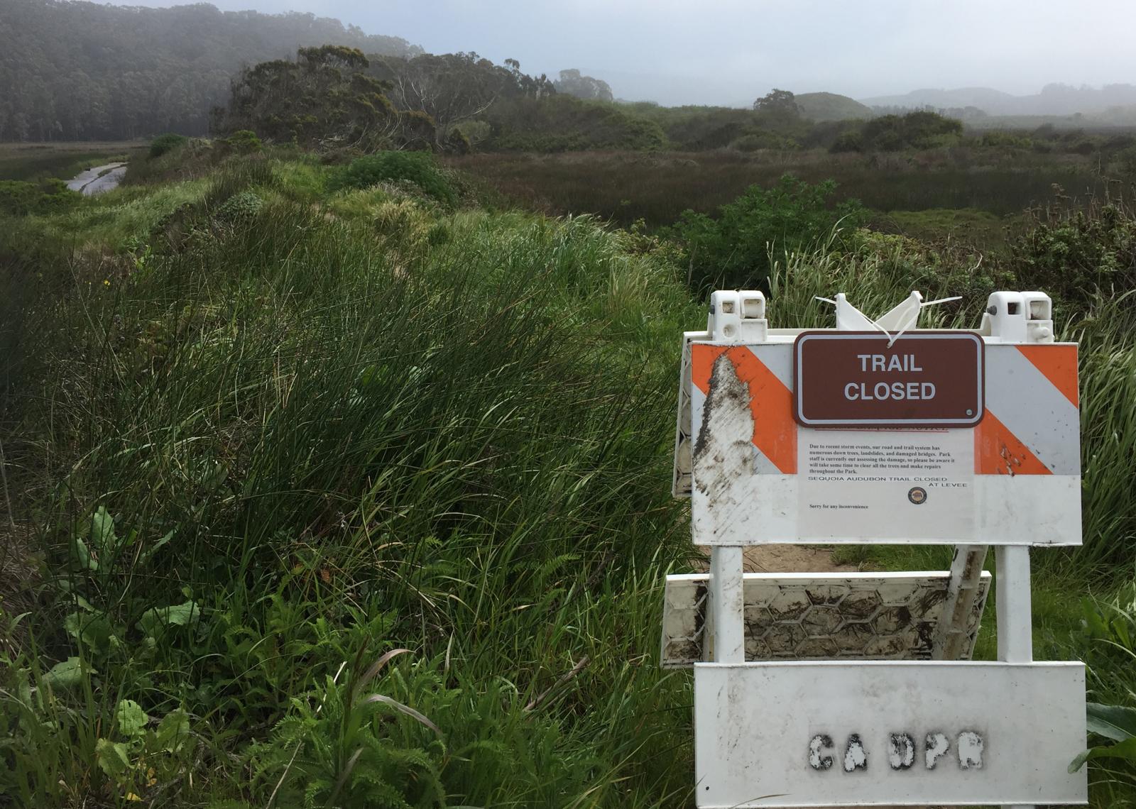 A “trail closed” sign board has been placed at the western approach to the levee. To ensure the safety of visitors, particularly children, and the continued circulation of tidal water to support life in the marsh, State Parks has closed this section of the trail until suitable repair or replacement can be done. The delay may bring more damage from wind, rain and even foot traffic. Meanwhile, the plants and animals that inhabit the marsh this time of year can continue to rely on it for food, shelter, respite and reproduction.