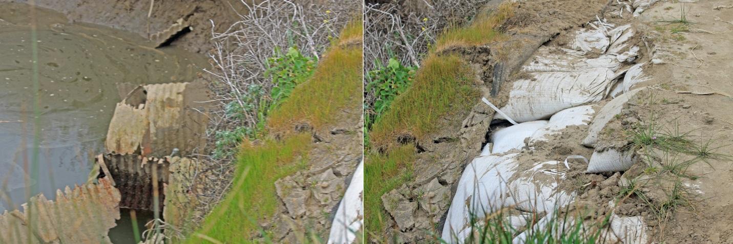 The trail over the levee is about 12 inches wide; it is bordered by water on two sides. The juxtaposed photos below show the northern edge of a section of the trail. Considerable erosion of the soil portion of the levee has exposed the supporting sandbags and disintegrating metal culverts.