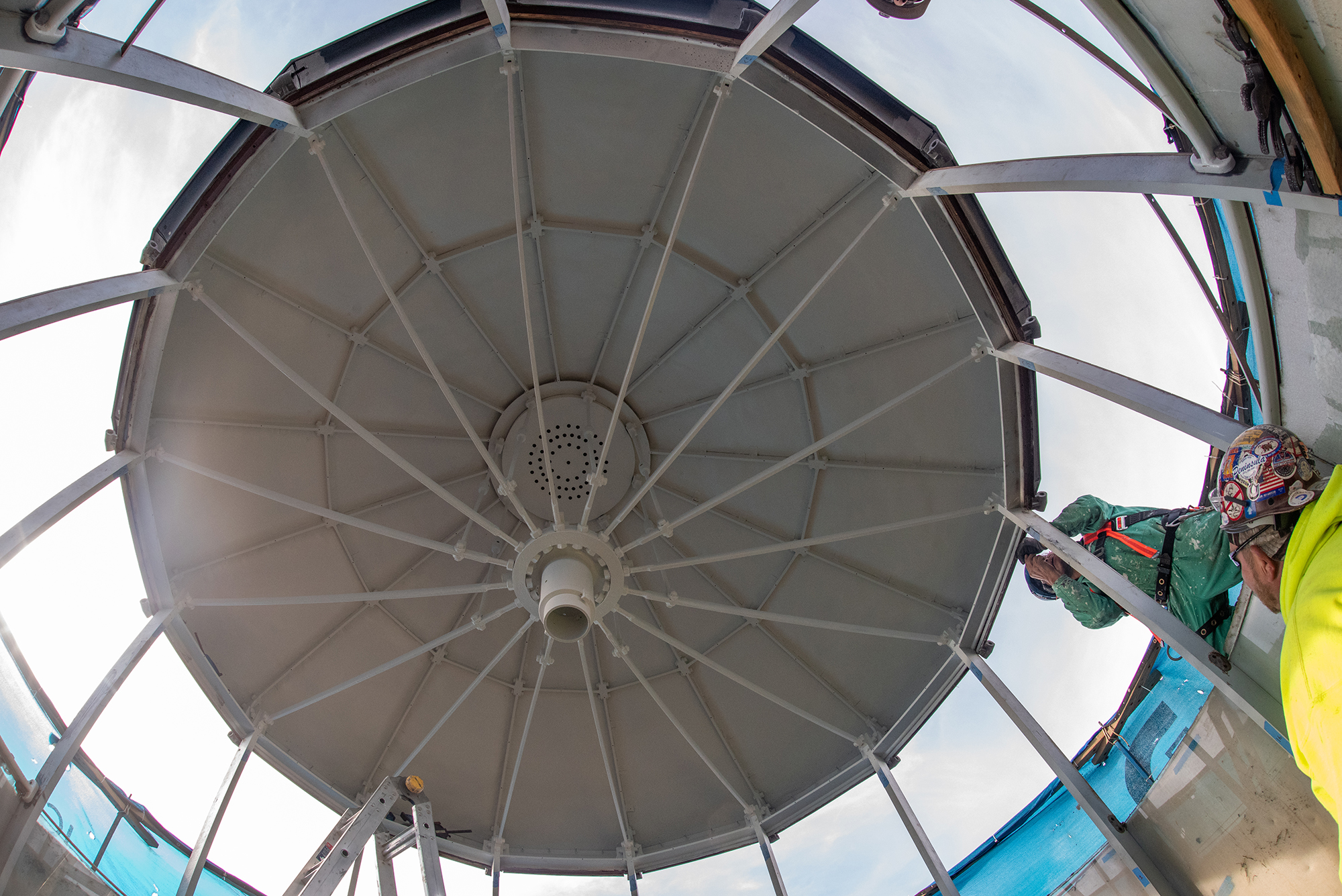 Meanwhile, on the outside, the tower has almost a startling new look. The full body scaffolding has been removed now that the exterior has been lead-abated and new coatings applied. The two collar scaffolds at the top will remain for the duration of the project to facilitate the masonry work and the installation of the new stainless-steel components when they return from Alabama.