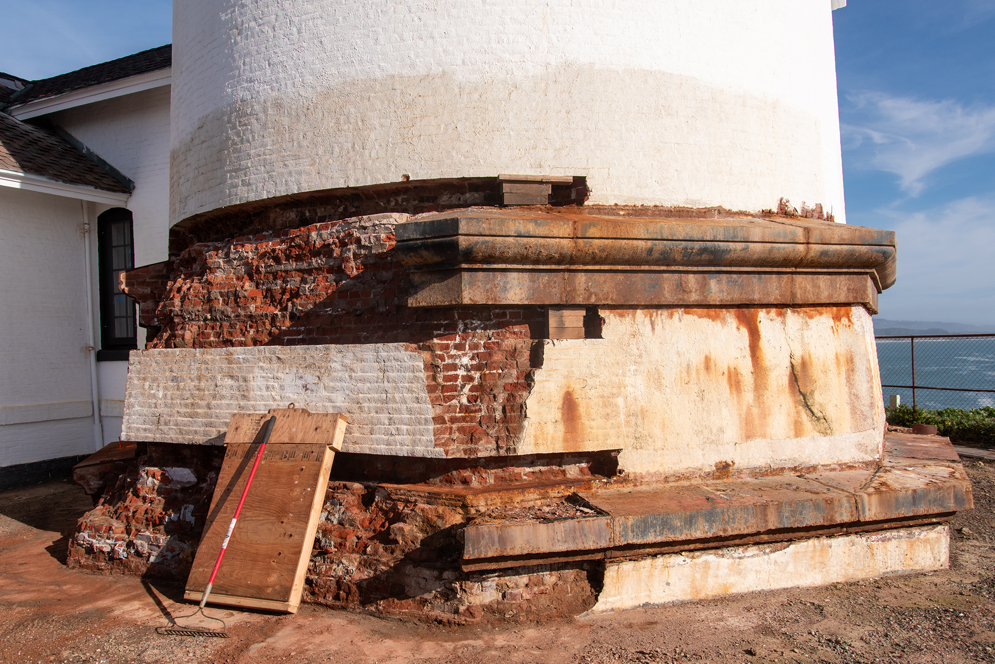 The watch room cast iron walls will be stripped and refurbished and the brick portions replaced. At the service room level below, the walls will be entirely rebuilt, with circular concrete bond beams added for strength and seismic stability.