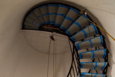 The interior stairs and landings have been painstakingly hand-repainted as have the walls, the windows have been reworked and are now functional and repointing of the mortar in certain areas is being done. The curtain walls in the lantern room are also being refurbished, with new tempered glass and the bronze framing and handholds stripped of old paint before new coatings applied.